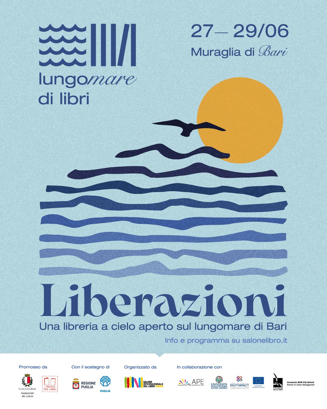 BARI – Da venerdì 27 a domenica 29 giugno Bari si trasforma in un’immensa libreria a cielo aperto con la quinta edizione di Lungomare di Libri, una manifestazione culturale che unisce oltre 70 appuntamenti tra incontri, letture, laboratori, dibattiti e mostre. Promossa dal Comune di Bari, dalla Regione Puglia e dal Salone Internazionale del Libro di Torino, con il sostegno dei Presìdi del Libro, l’evento si snoda tra luoghi simbolo della città: dalla Muraglia al Fortino Sant’Antonio, da Piazza del Ferrarese allo Spazio Murat, passando per l’ex Mercato del Pesce, il Museo Civico e il Museo Archeologico di Santa Scolastica.