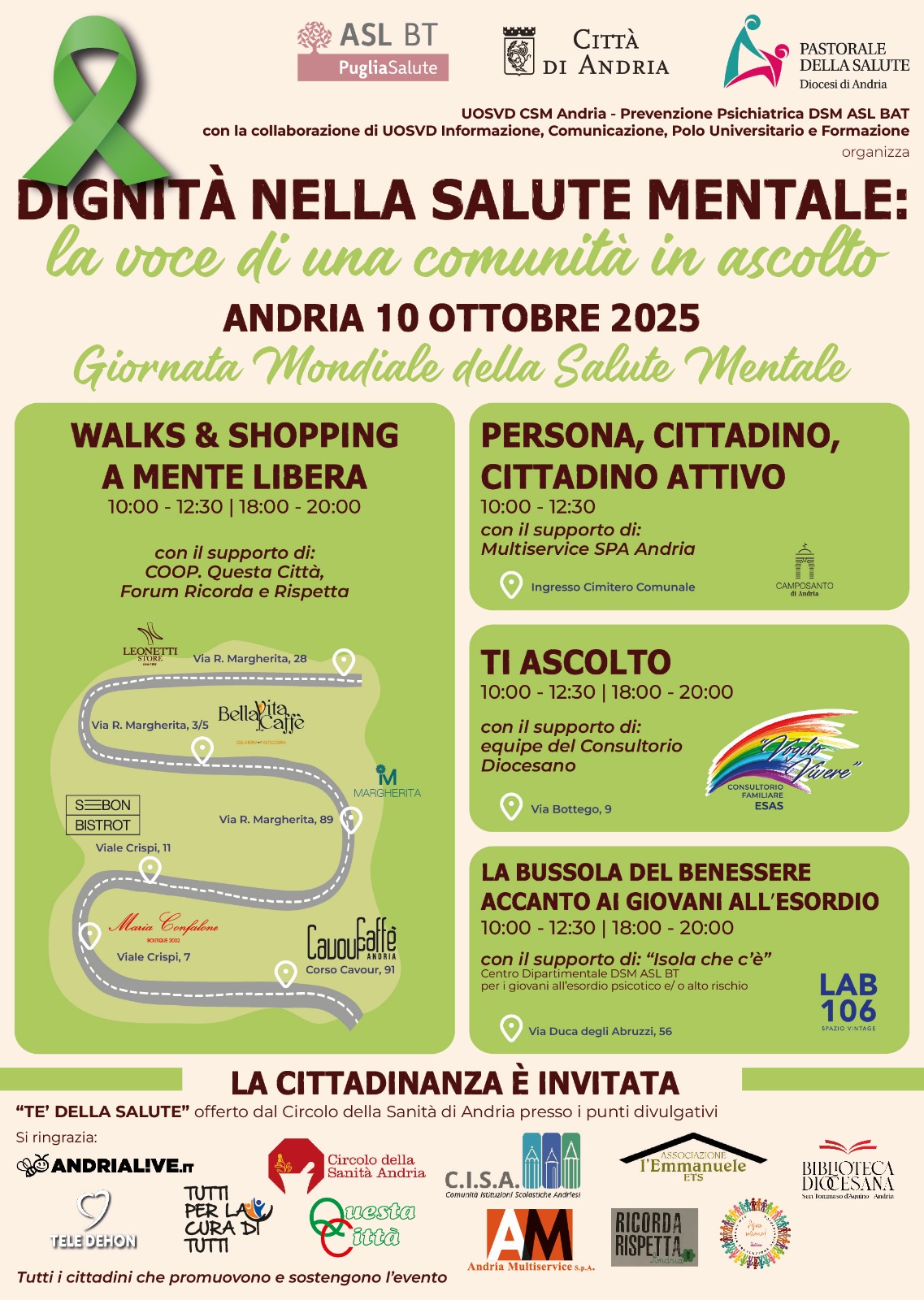 In occasione della Giornata Mondiale Salute Mentale, venerdì 10 ottobre, il Dipartimento di Salute Mentale dell’ASL BT (Azienda Sanitaria Locale Barletta-Andria-Trani) scende in campo con un duplice e articolato programma di iniziative. Promosse dal Centro di Salute Mentale Andria-Prevenzione Psichiatrica, le attività coinvolgeranno le città di Andria e Bisceglie con l’obiettivo comune di sensibilizzare, superare lo stigma e promuovere l’importanza della diagnosi precoce e dell’accesso alle cure.