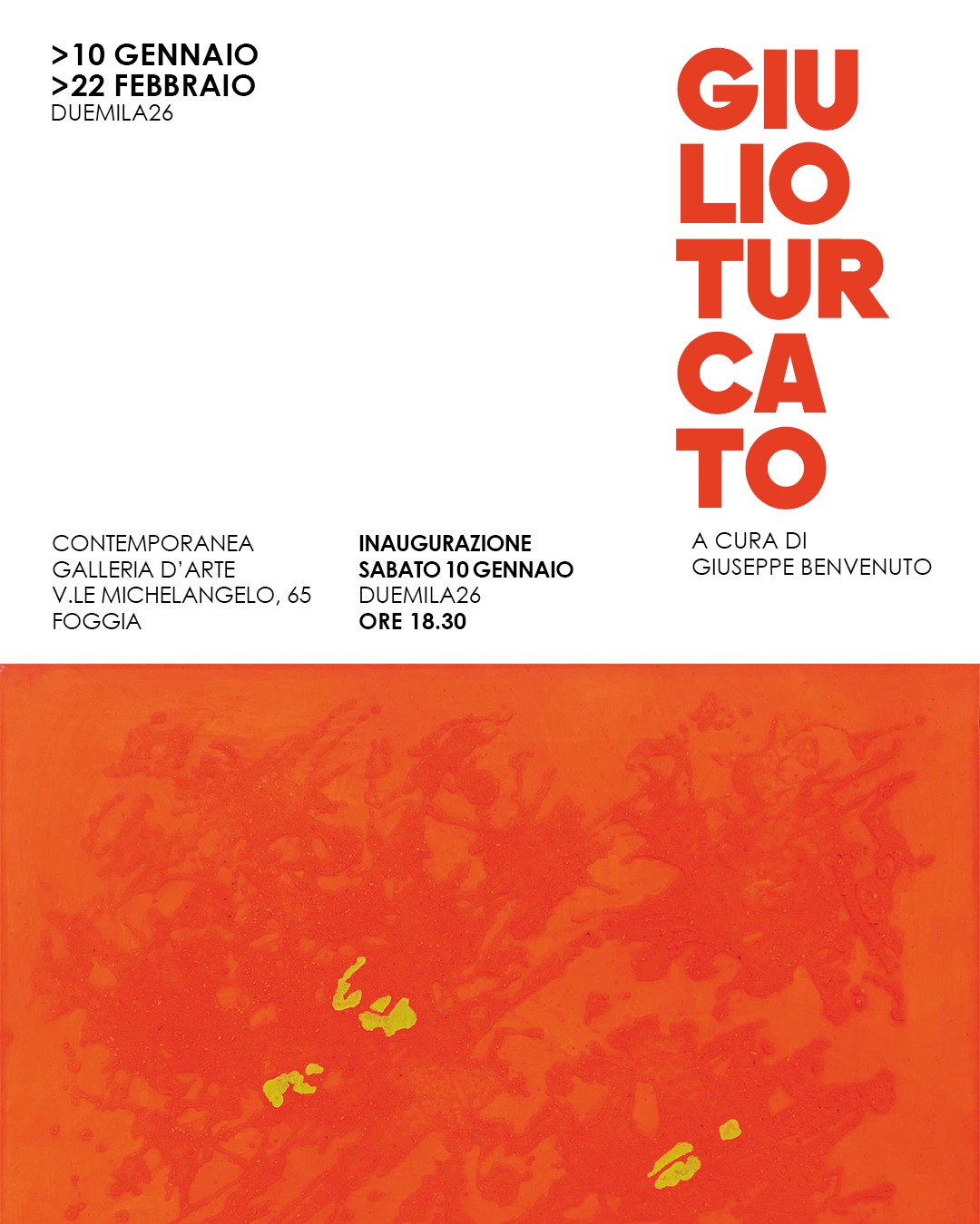 Se desiderate immergervi di persona nell’universo creativo di Giulio Turcato, potete visitare l’esposizione presso la Contemporanea Galleria d’Arte di Giuseppe Benvenuto, situata a Foggia in viale Michelangelo 65. La mostra, inaugurata lo scorso 10 gennaio, resterà aperta al pubblico fino al 22 febbraio 2026 accogliendo i visitatori tutti i giorni (ad eccezione dei festivi) dalle 10:00 alle 13:00 e il pomeriggio dalle 16:00 alle 20:00. Per informazioni è possibile contattare il numero 346 7334054 o scrivere a artebenvenuto@gmail.com.