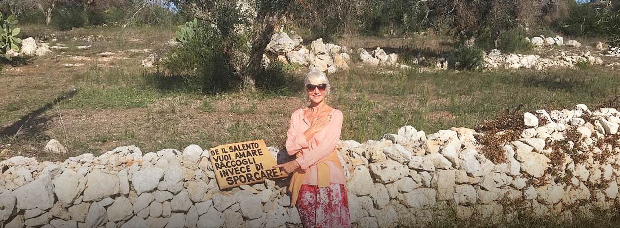 “Un grande grazie, ‘grazie mille’ a chiunque abbia scritto questo cartello e lo abbia posizionato nel punto esatto in cui mia sorella ha scattato la foto di me con la spazzatura che avevamo raccolto. Questo slogan è geniale. I politici ne prendano atto e lo usino! Rendiamo il Salento il più bello possibile. Soprattutto ora che soffre con la terribile Xylella”.