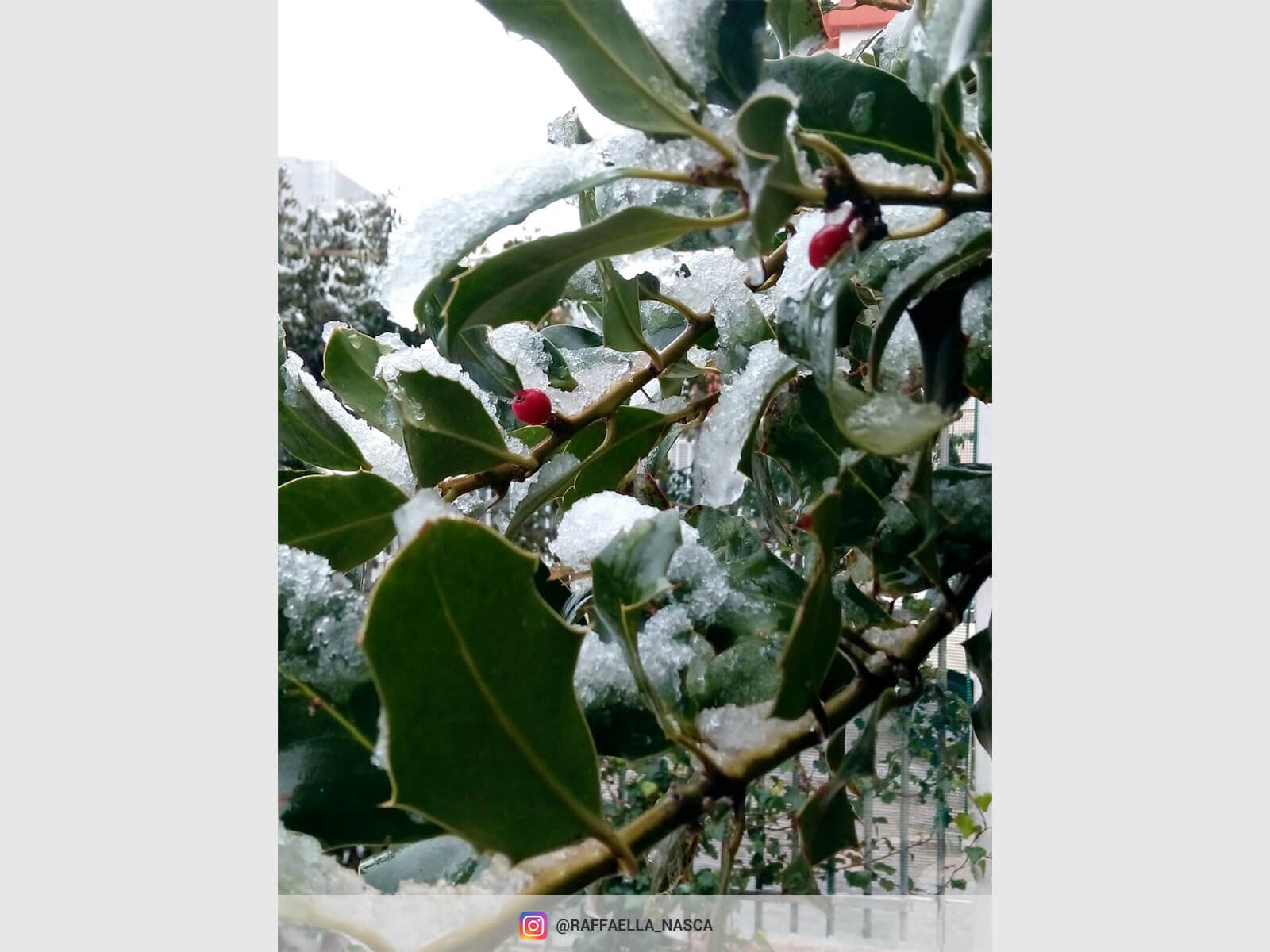 La gioia della neve, o il “priscio” come diremmo in dialetto, deriva dalla circostanza consueta della breve durata di questo fenomeno, la cui portata raramente è tale da creare disagi, mentre spesso è così limitato nel tempo da lasciarci godere solo ed esclusivamente della bellezza che lo caratterizza. Gli ulivi secolari hanno accolto sulle loro tenere foglie la candida copertura di neve, ma è nel contrasto con alcune specie di fiori che il bianco risalta nel cuore di un rosso vivace, lasciandoci assaporare tutta la bellezza di questa veloce nevicata di fine febbraio.