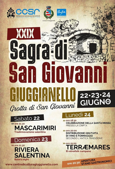Per il ventinovesimo anno consecutivo, a soffiare il vento d’estate sulla cittadina di Giuggianello sarà l’attesissima Sagra di San Giovanni. Tra le più antiche di tutta la provincia leccese, questa festa rievoca un antico culto medioevale legato a riti pagani del mondo antico, oggi purtroppo in disuso, dal 1990 affidato alle cure del Centro di Cultura di Giuggianello.