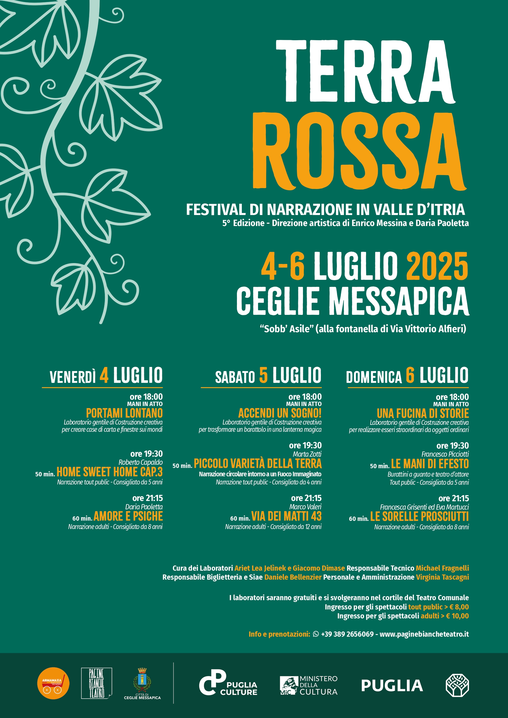 CEGLIE MESSAPICA – Torna a Ceglie Messapica la quinta edizione di Terra Rossa, il Festival di Narrazione in Valle d’Itria, che dal 4 al 6 luglio 2025 trasformerà il quartiere ottocentesco “Sobb’Asile” in un teatro a cielo aperto. Organizzato con la direzione artistica di Enrico Messina e Daria Paoletta e sostenuto da Puglia Culture e Amministrazione Comunale, il festival propone un ricco programma di spettacoli e laboratori dedicati a bambini e adulti.