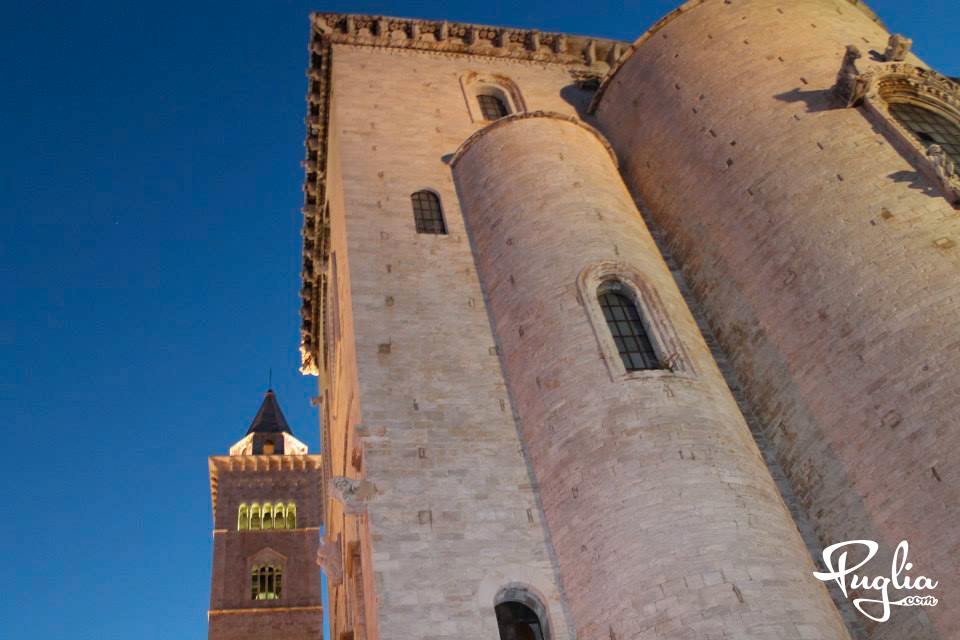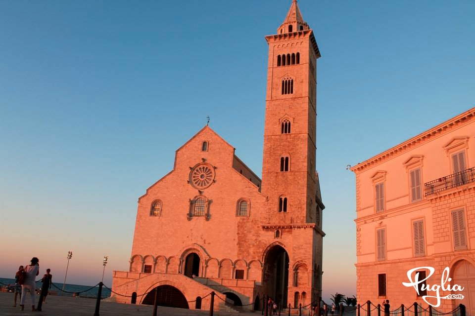 La cattedrale di Trani è uno dei simboli della Puglia, ed è un finissimo esempio di romanico pugliese. L’attuale basilica è stata fondata nel 1097 ed è intitolata a San Nicola Pellegrino; è stata edificata sull’antica chiesa di S. Maria della Scala ed ha avuto numerose fasi costruttive. Nell’800 fu manomessa gravemente all’interno ed è stata riportata all’originale eleganza di forme nel secolo scorso. Il campanile, alto 58,90 m, nel 1954 a causa dei problemi di staticità è stato completamente smontato e successivamente ricostruito utilizzando lo stesso materiale.